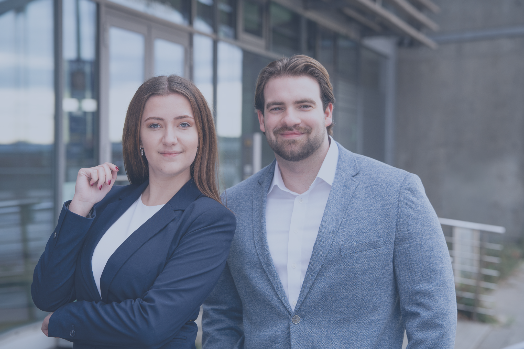 Junge Frau in dunklem Blazer und Jeans steht auf einer Brücke, im Hintergrund eine moderne Stahlstruktur und eine städtische Umgebung.